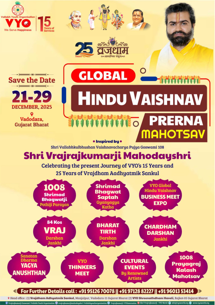 Join us in celebrating 15 years of VYO & 25 years of Vrajdham Aadhyatmik Sankul with a grand spiritual and cultural festival inspired by Shri Vrajrajkumarji Mahoday Shri!